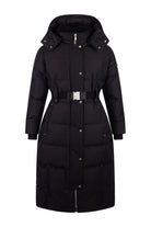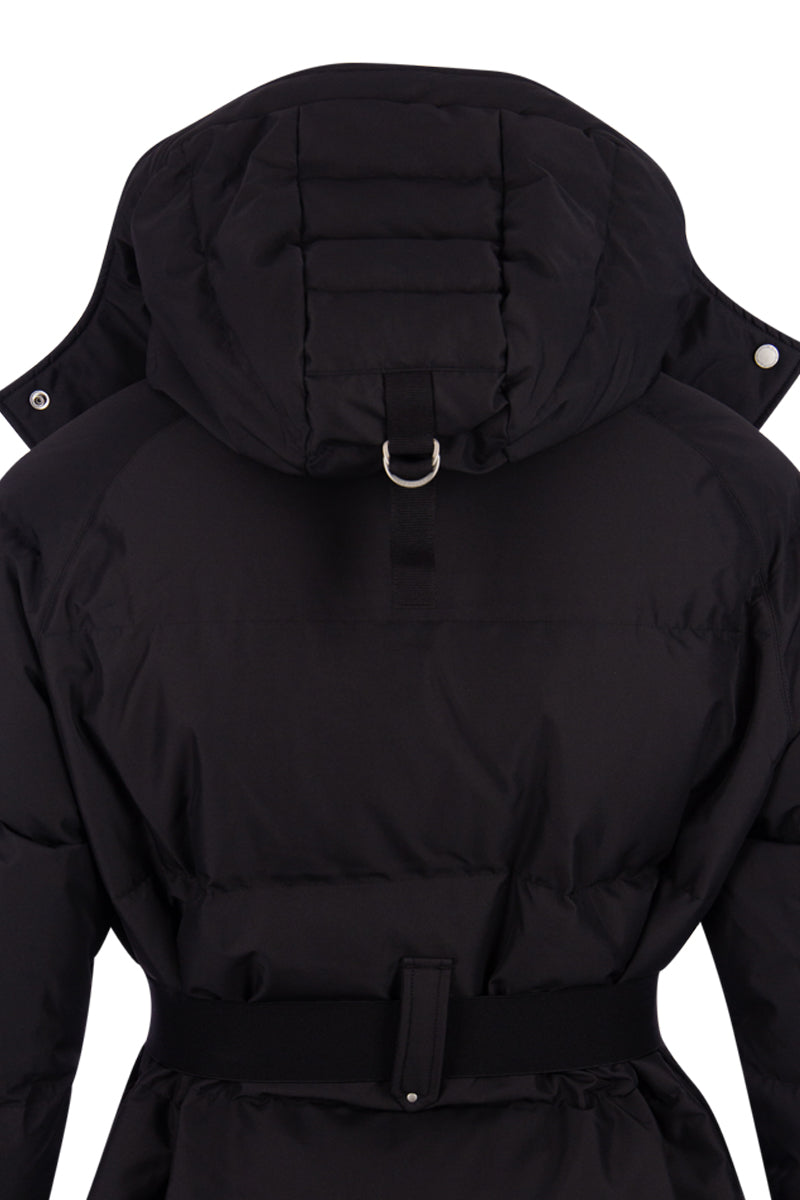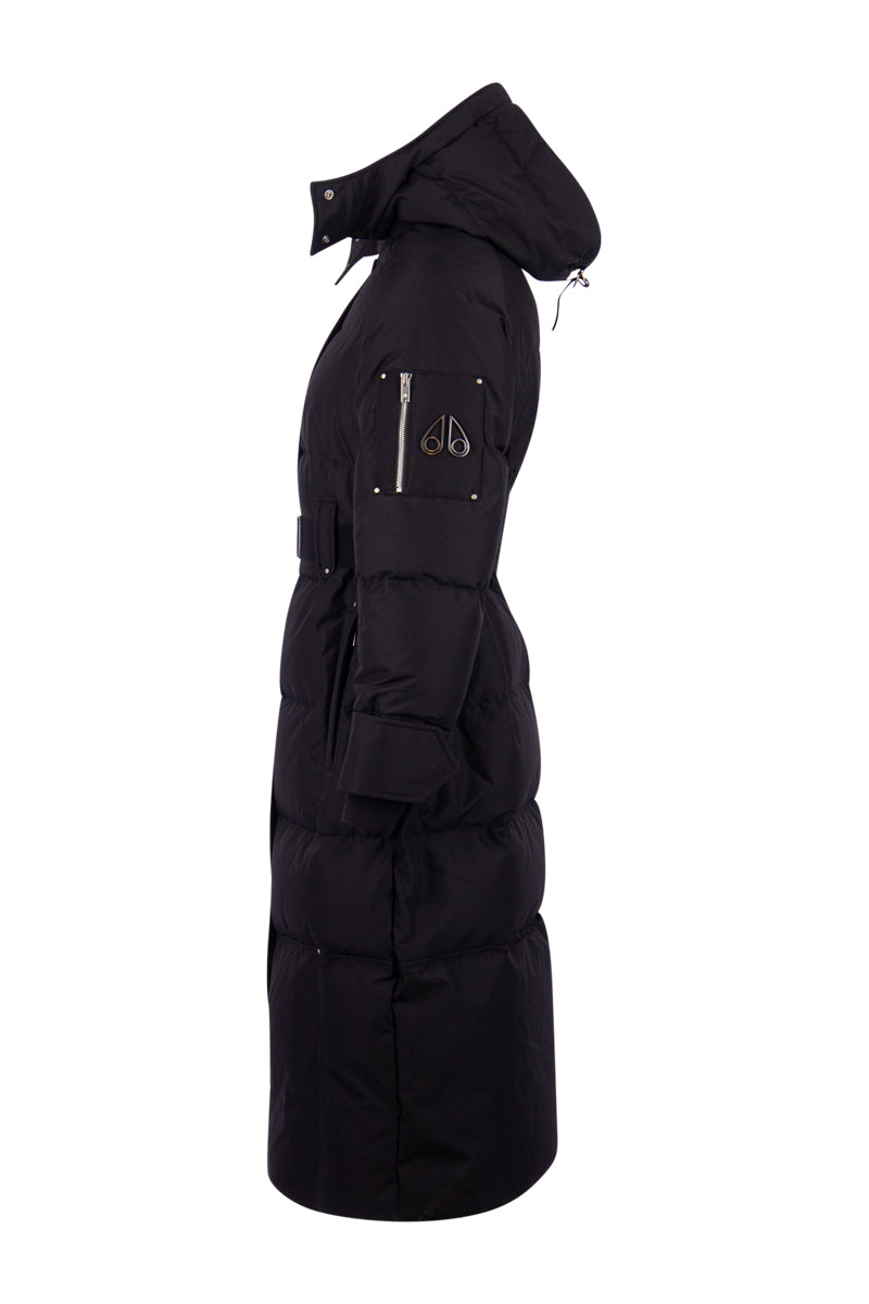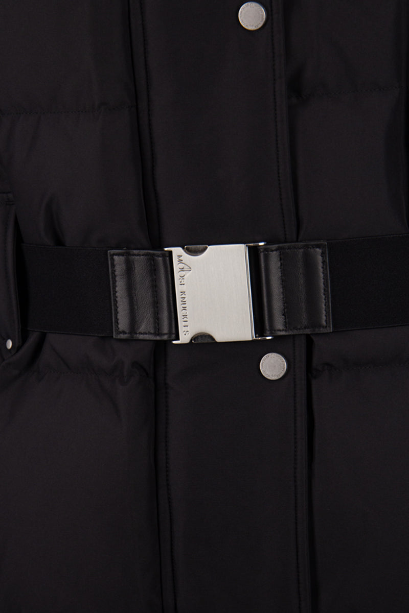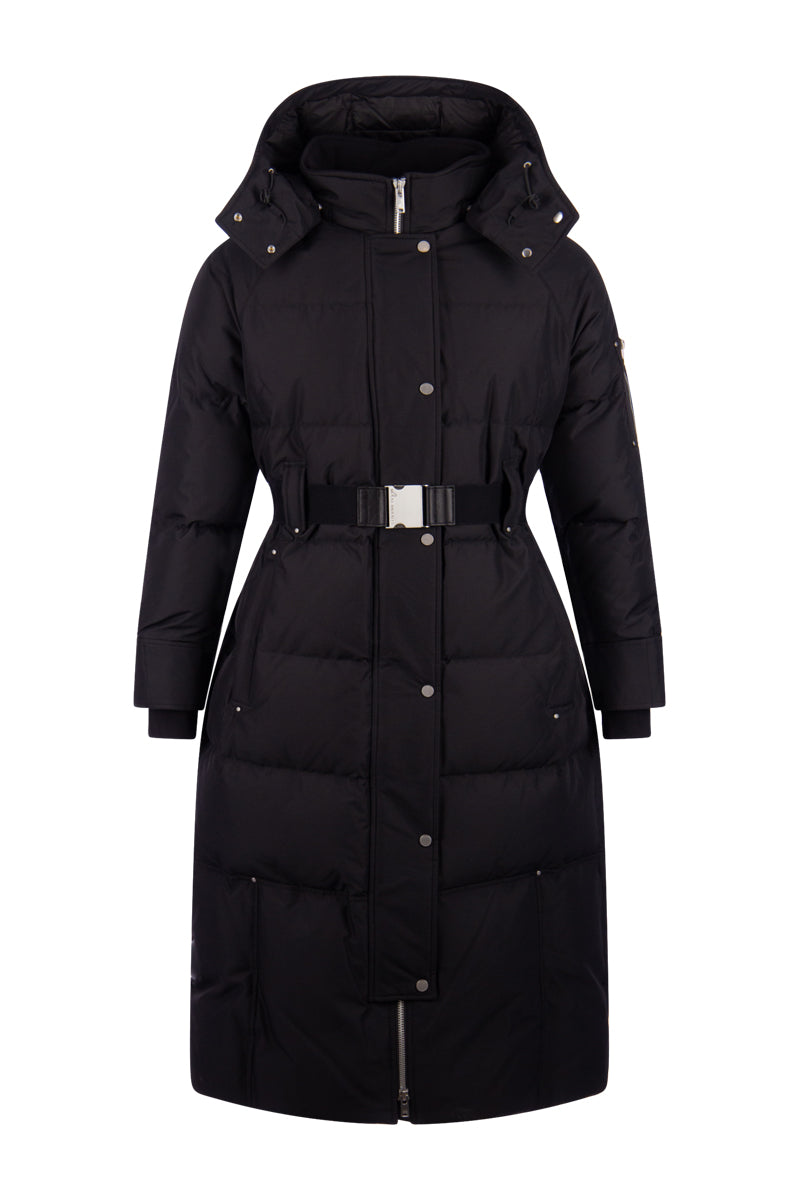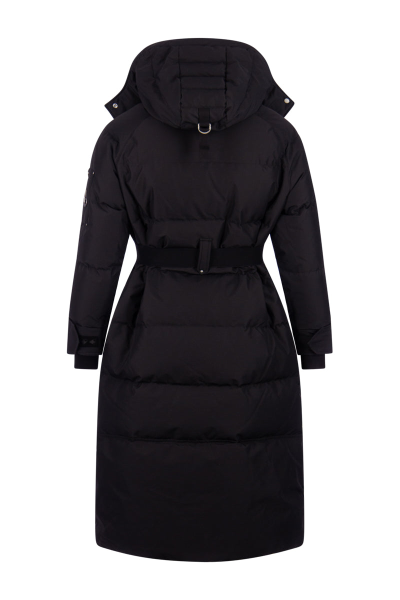 This black " W Cloud Long Parka " ( 292 black ) is from the Moose Knuckles brand. This winter coat reaches the calves and therefore covers almost the entire body. The oversized fit makes the coat extra comfortable. The waist belt with metal details compliments the coat. This Moose Knuckles coat is specially designed to keep you warm on cold days. The W Cloud Long Parka has a detachable hood and the iconic Moose Knuckles logo on the left sleeve.