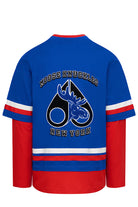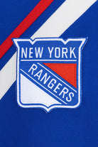 This Moose Knuckles sweater features a striking blue design, inspired by the New York Rangers. The sweater features long sleeves with red and white accents that contrast with the base color. Two patches are located on the chest: the New York Rangers logo and the NHL emblem.