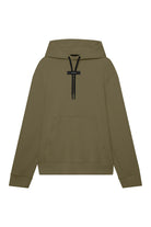 This hoodie has a standard fit. The spacious, functional kangaroo pocket at the front offers practical storage. The lined hood is adjustable with a black drawstring. Ribbed cuffs and hem create a snug and sleek finish. A subtle black patch with brand details adorns the chest.