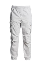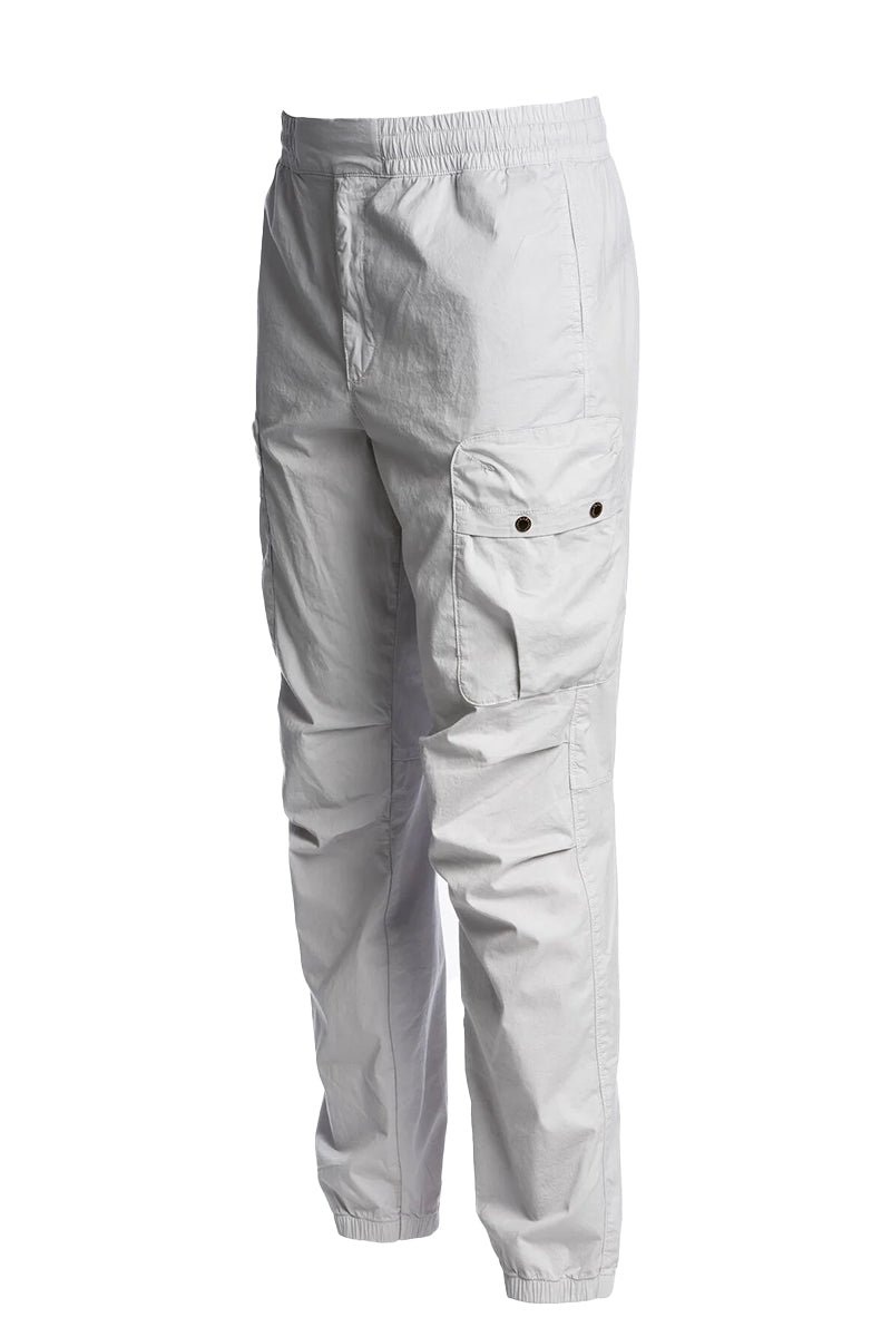 Light gray cargo pants with a modern fit. They feature a sturdy elastic waistband for comfort and flexibility. They also feature multiple pockets, including two side pockets with button closures and two back pockets. Elastic cuffs at the ankles ensure a snug fit. Subtle branding details are featured on the pockets.Color: light gray.