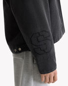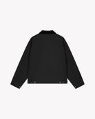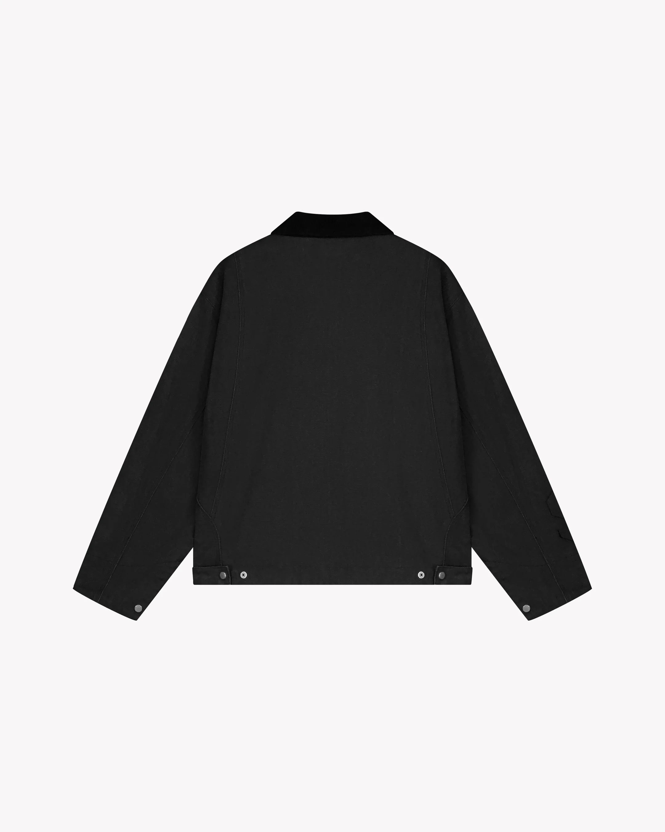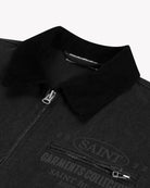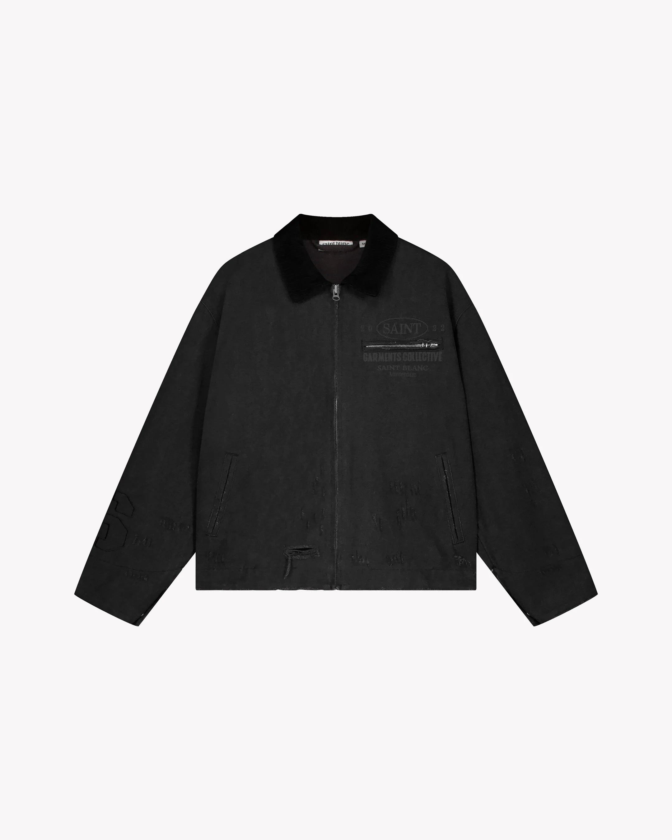 The Saint Blanc GARMENTS COLLECTIVE DISTRESSED JACKET BLACK is a signature piece from the Saint Blanc collection. This men's jacket features a deep black, bleached wash with a striking distressed finish throughout. The design features a contrasting, soft velvet or corduroy collar. The industrial workwear style is emphasized by the large, tone-on-tone logo and text details on the chest.