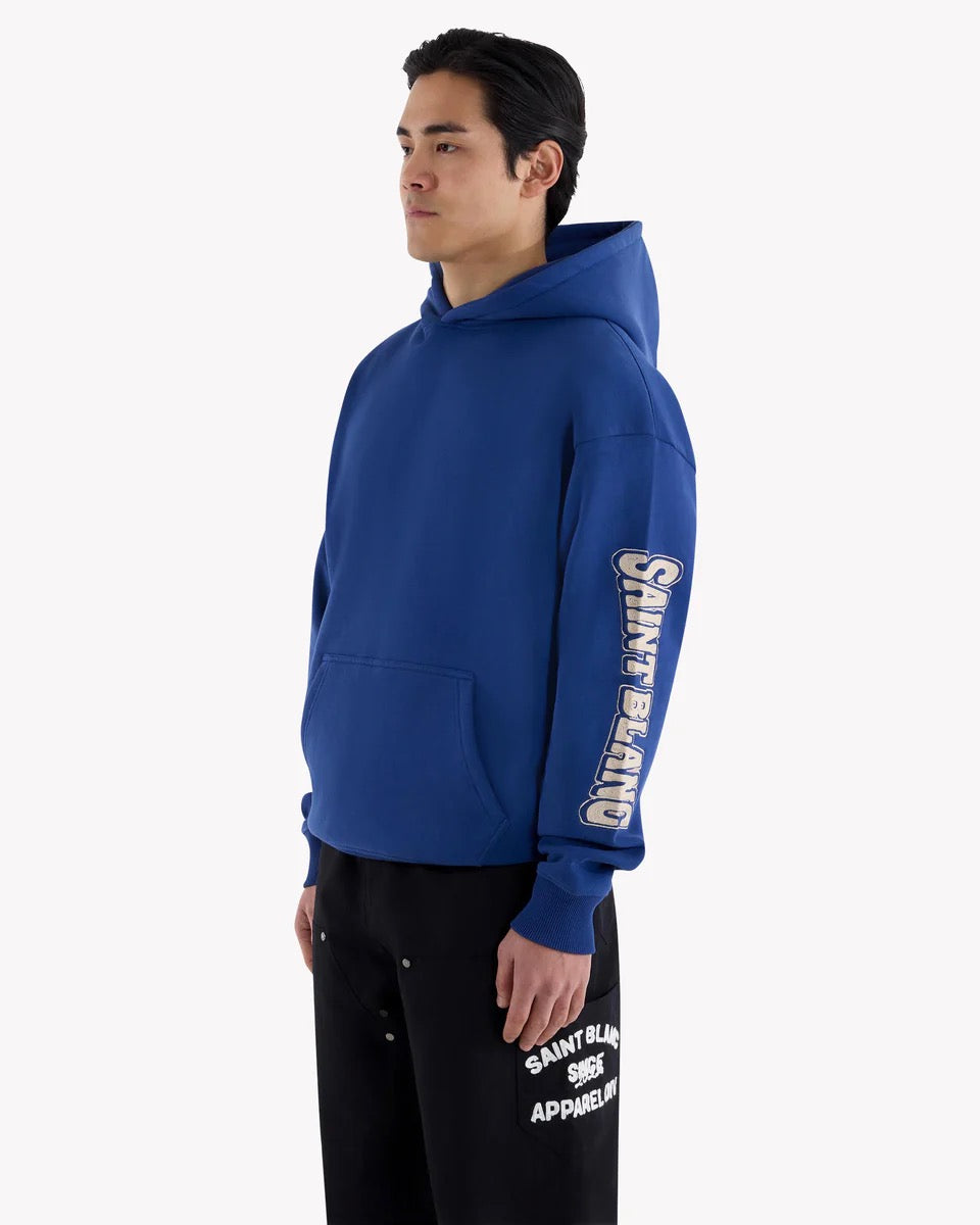 This relaxed-fit hooded sweatshirt features a large kangaroo pocket at the front. The hoodie features a striking SAINT BLANC logo print along the sleeve. Ribbed cuffs and hem create a finished look. Available in bright blue.