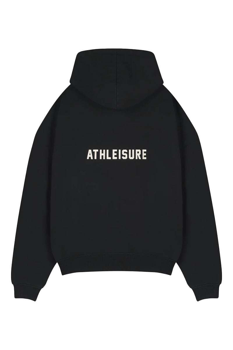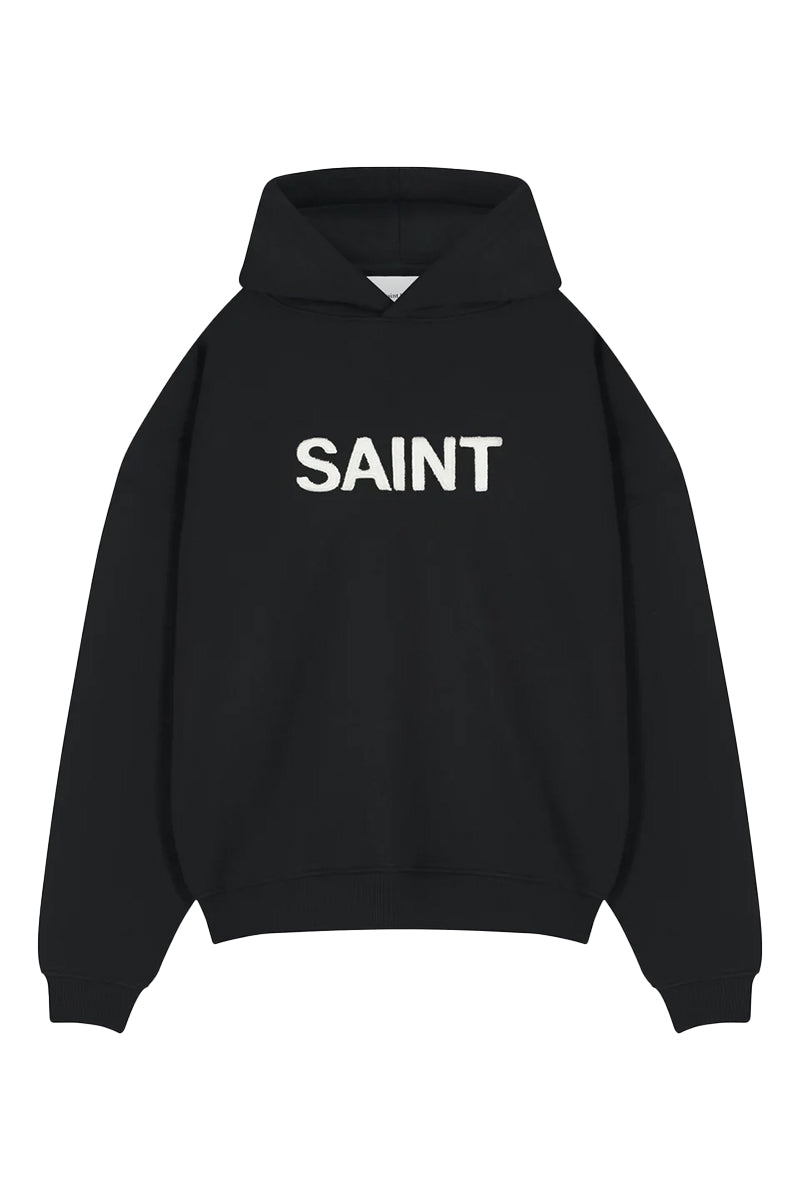 SAINT BLANC sweater with a comfortable hoodie. Relaxed fit. The front features a striking white "SAINT" print, while the back features "ATHLEISURE." A generous hood. Ribbed cuffs and hem create a neat finish. Suitable for a variety of occasions.