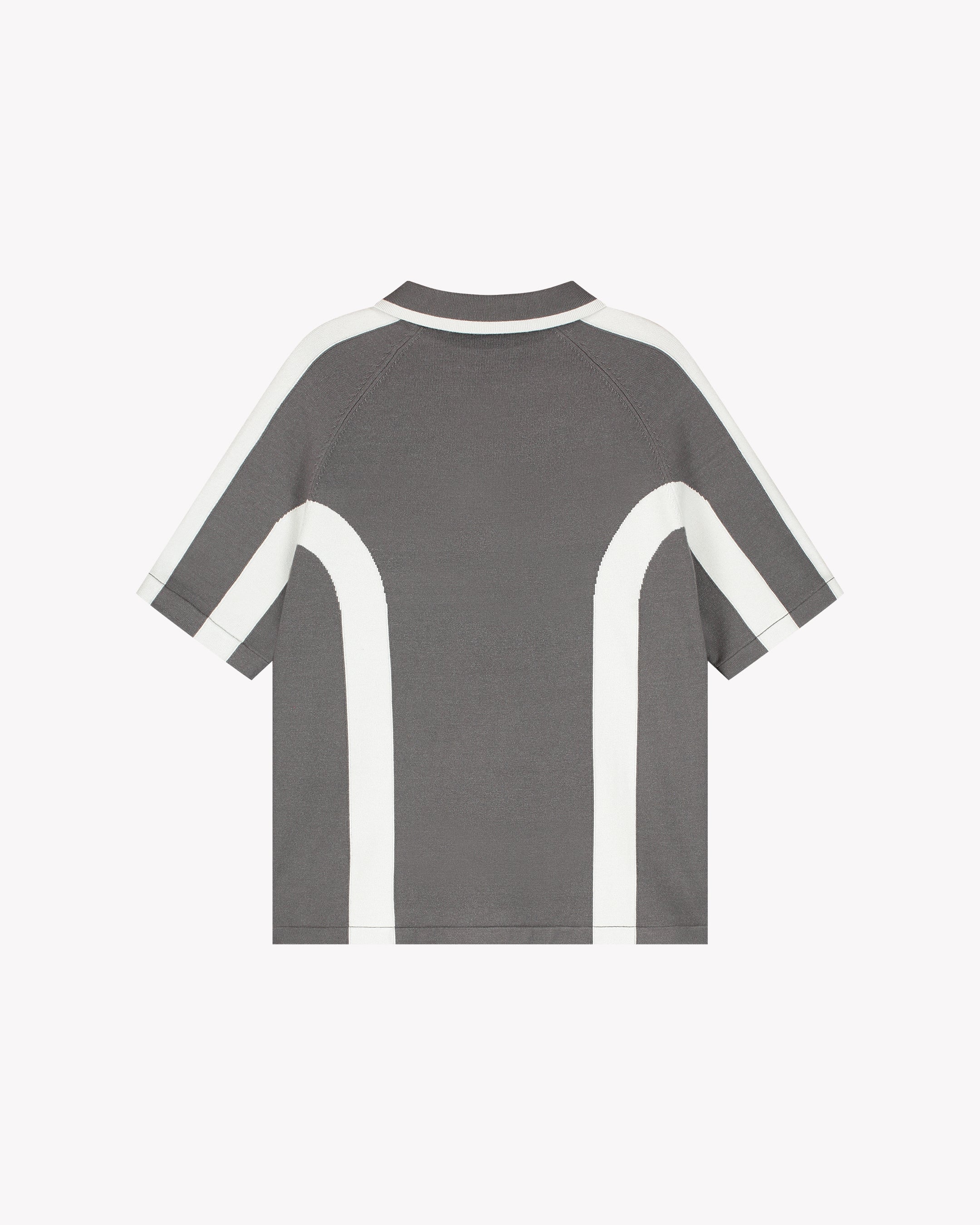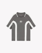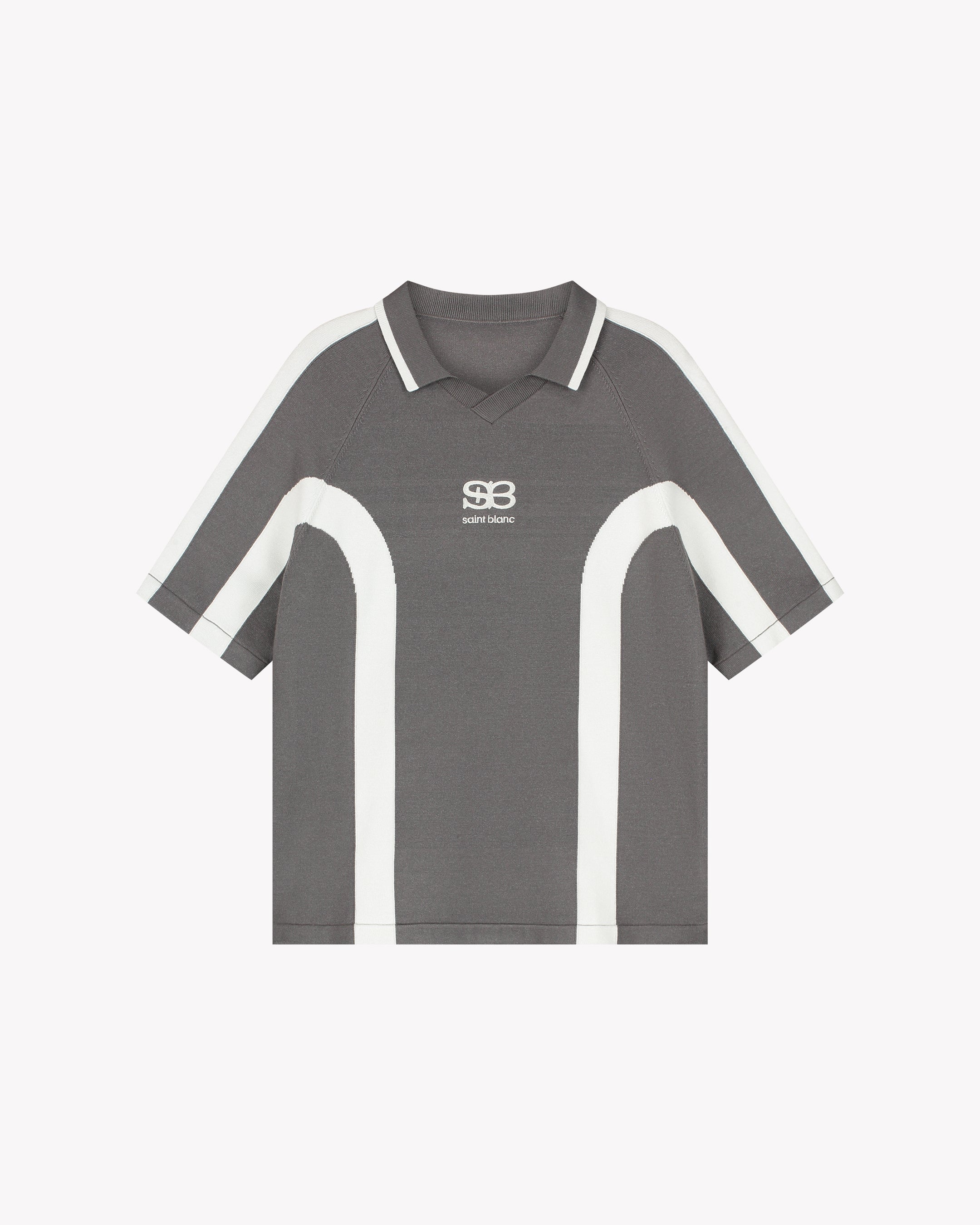 Saint Blanc sweater with a striking raglan design. It comes in a dark gray shade and features contrasting white stripes that accentuate the sides and sleeves. The sweater has a casual, relaxed fit. The V-neckline and short sleeves contribute to the modern look. A subtle Saint Blanc logo is placed centrally on the front. This sweater is perfect for pairing with various styles, such as jeans or casual chinos.