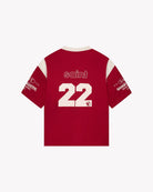 The Saint Blanc T-SHIRT COLLECTIVE JERSEY RED is a striking men's shirt from the Saint Blanc brand. This jersey has a strong retro sportswear style, with a nod to American sportswear. The design is characterized by its deep red color and the contrasting cream V-neck and shoulder inserts. The prominent white print of the number "22" on both the chest and back takes center stage.