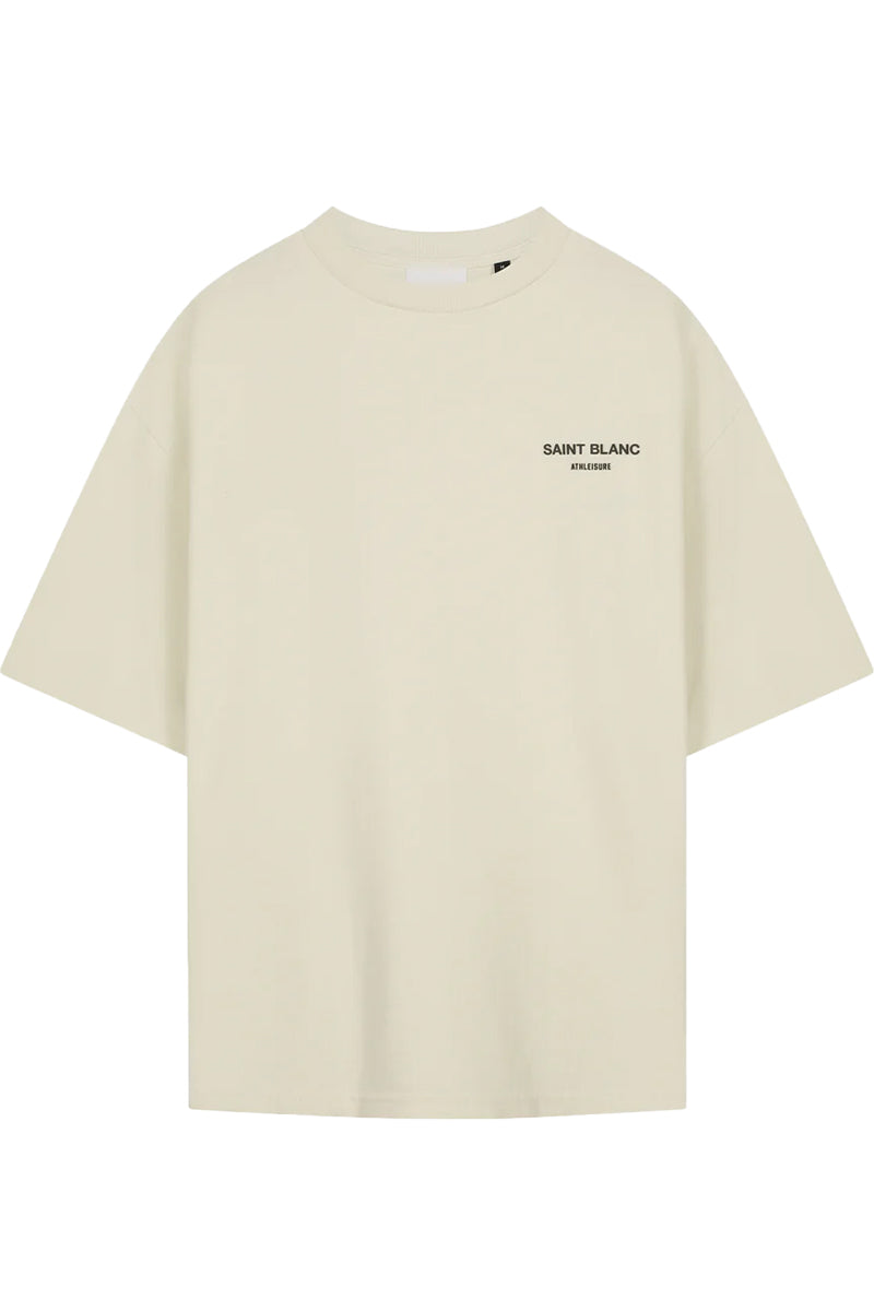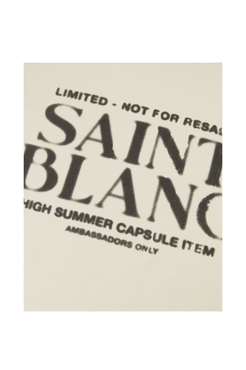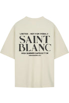Loose-fitting T-shirt with a round neck and short sleeves. Detailed print on the back, with the brand logo subtly displayed on the chest. Color: off-white. Part of Saint Blanc's exclusive summer collection.