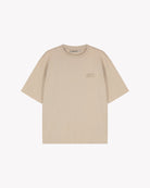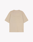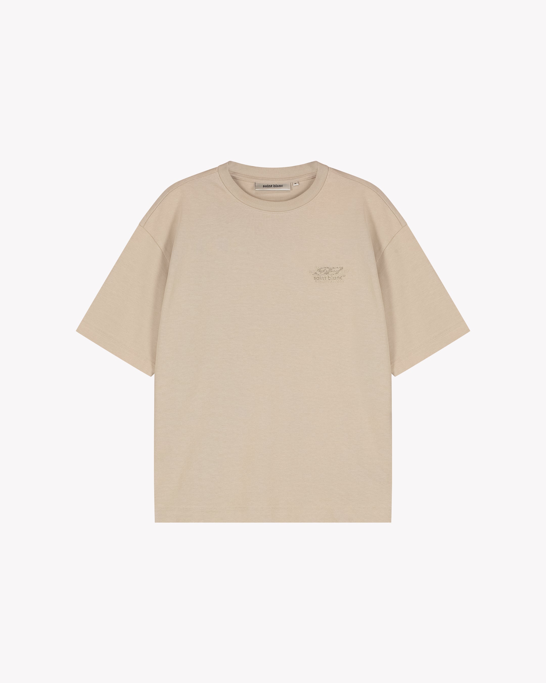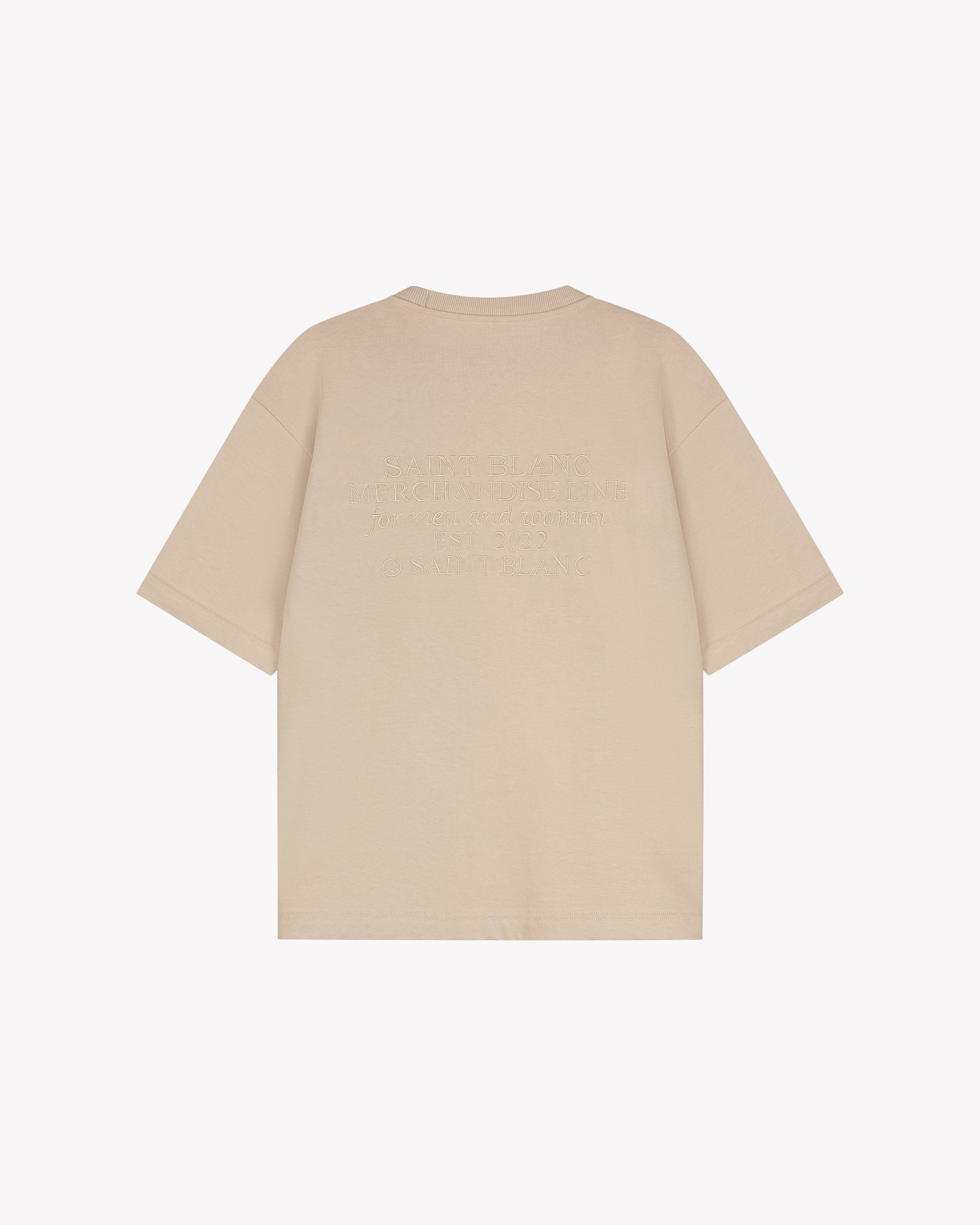 This Saint Blanc T-shirt comes in a neutral beige hue. It features a classic crew neck and short sleeves. Subtle branding is visible on the front, while the back features a larger embroidered text. The minimalist design is versatile and can be paired with a variety of outfits.