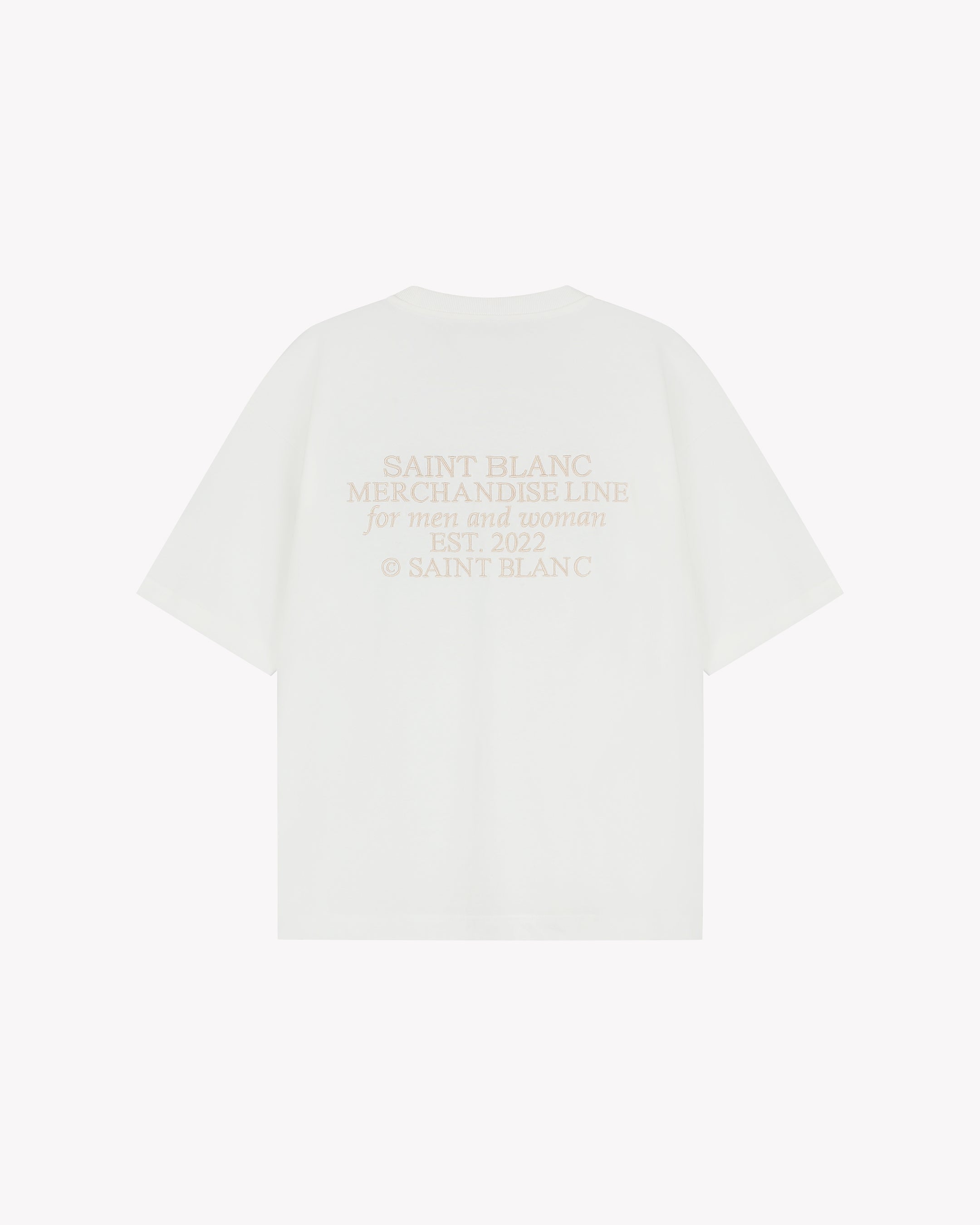 SAINT BLANC T-shirt in a white design. The T-shirt has a classic round neckline and short sleeves. A subtle brand logo is printed on the chest. The back of the T-shirt features a larger print with the text "SAINT BLANC MERCHANDISE LINE for men and women, EST. 2022 © SAINT BLANC". The design exudes simplicity and modernity. Suitable for various casual occasions and easy to combine with different styles.