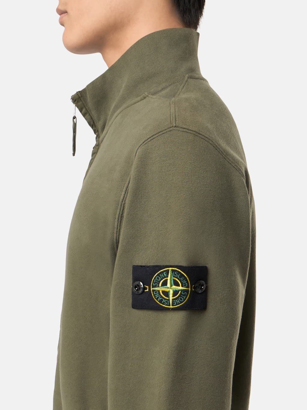 High-neck sweater with a front zip. Features the distinctive Stone Island logo on the sleeve. Practical side pockets without closures. Ribbed cuffs and hem for a sleek finish.