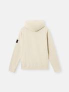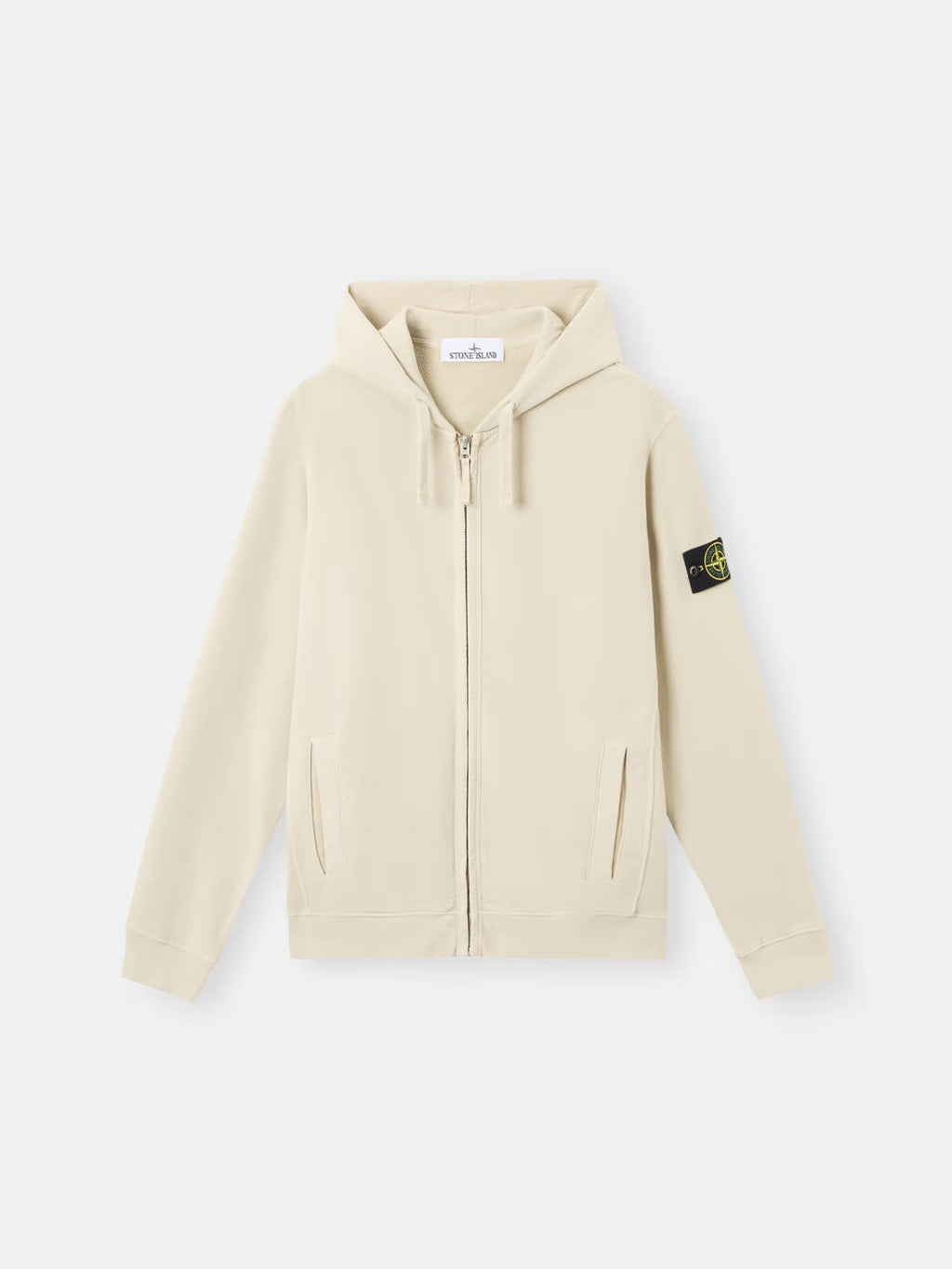 This beige Stone Island sweater is designed with a regular fit and features a full-zip closure. The hood has a drawstring. The sweater has two front slit pockets. The iconic Stone Island logo is on the left sleeve. Ribbed cuffs and hem.