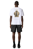 This Stone Island T-shirt is made of high-quality material and offers a standard fit. It comes in a classic white color and features a crew neckline. The front features a subtly embroidered Stone Island Archivio logo, while the back features a striking print with brand details and an image of a jacket.