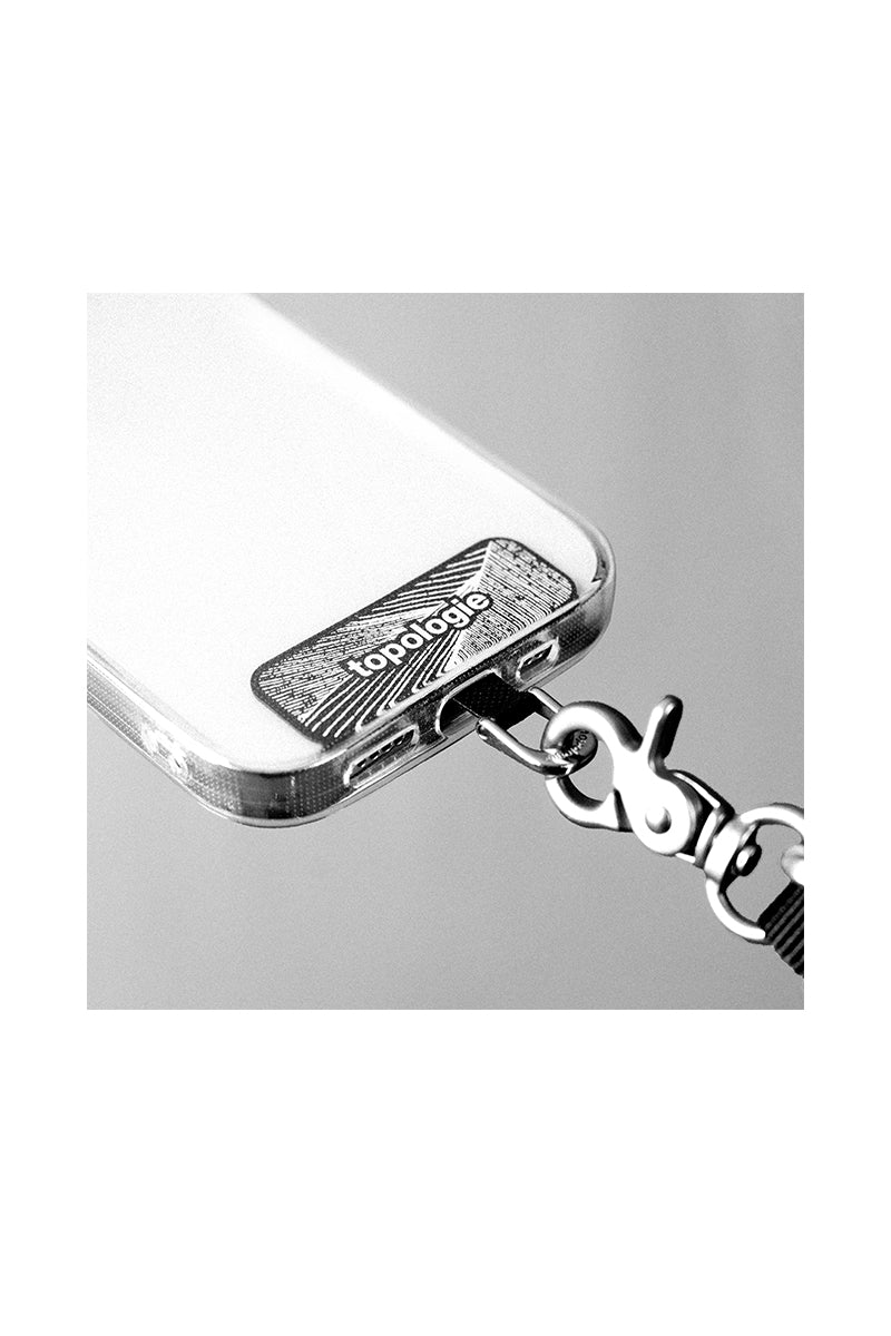 Phone case adapter with D-ring for phone strap attachment. Designed for compatibility with various phone models. Made of durable material with a sturdy design. Features a D-ring for easy adjustment and attachment. Minimalist design with a subtle Topology logo creates a modern look. This adapter offers versatile carrying options with strap functionality.