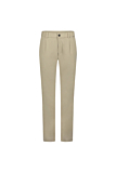 Sleek trousers with a tailored fit, featuring a zip fly and button closure. Two side pockets and two rear welt pockets for practicality. Subtle brand embroidery on the back waistband. Belt loops for accessorizing. Neutral sand-khaki tone complements a variety of outfits. Ideal for casual or smart-casual looks.