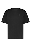 Classic black T-shirt featuring a relaxed fit. Crew neck design with short sleeves. Small embroidered logo on the chest and a larger decorative print on the back. Minimalist front and detailed back design.