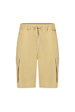 Casual beige shorts with a relaxed, knee-length fit. Features cargo pockets on both legs for added storage. Adjustable drawstring waistband ensures a snug fit. Back welt pockets enhance the design with additional practicality. Minimal branding for a clean look.