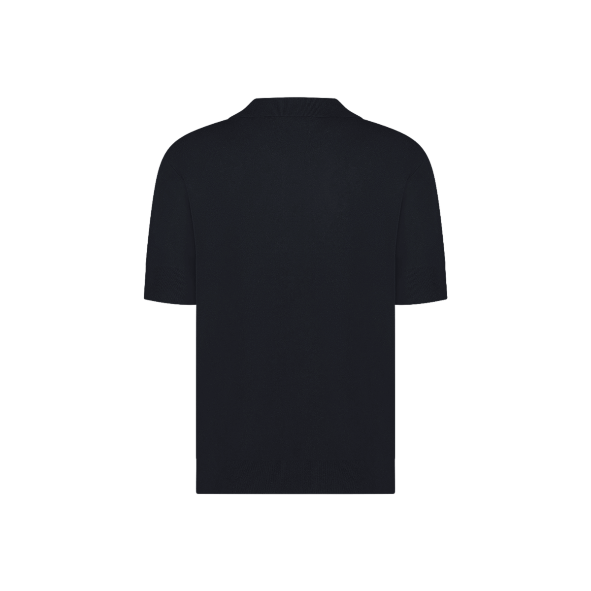 Short-sleeve knitwear with button-down front. Classic collar. Ribbed hem and sleeves for structured fit. Solid dark blue design. Minimal brand tag on the lower edge enhances subtle detailing. Suitable for layering or standalone wear.