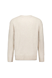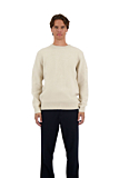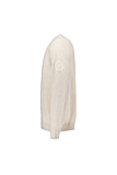 Beige knit sweater with ribbed cuffs and hem. Crew neck design. Embroidered logo on the sleeve. Suitable for casual layering.