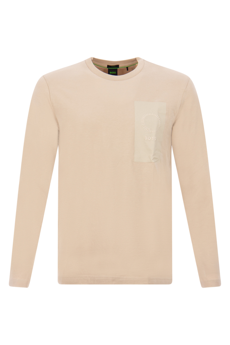Stylish long-sleeve sweater with a regular fit. Features a subtle embroidered Boss logo on the chest pocket. Crew neck design for classic appeal. The neutral beige color adds versatility to your wardrobe. Ideal for layering or wearing on its own.