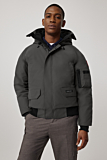 Bomber jacket featuring a robust design with practical functionality. Equipped with a full zip closure and an adjustable hood with a drawstring. The jacket includes multiple pockets: two on the front with flap closures and a zippered pocket on the sleeve. Ribbed cuffs and waistband provide a snug fit. Discreet Canada Goose branding patch is featured on the left arm.