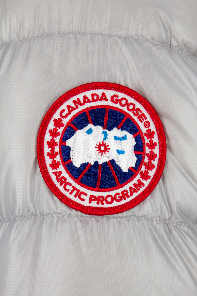 Light grey jacket with a regular fit, featuring a quilted design. Full-length front zipper closure. Two zippered hand pockets on the sides. Adjustable drawstring hood. Signature Canada Goose logo patch on the left sleeve. Elasticized cuffs for a secure fit.