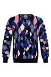 This sweater features a bold, multicolored design with dominant blue, pink, and white tones. The striking pattern covers the entire knitwear, offering a unique visual statement. This piece is part of the Carlo Colucci collection, showcasing their signature style. The sweater has a classic crew neck and long sleeves, providing a standard fit. Brand logo detailing is integrated into the pattern on the sleeves, adding distinct branding elements. Ribbed cuffs and hem ensure a snug, comfortable fit.