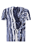 T-shirt with a striking abstract pattern in varying shades of blue. Relaxed fit, perfect for casual wear. Crew neck design, short sleeves. Intricate design details are woven into the fabric, creating a textured appearance. Signature emblem subtly included within the pattern.