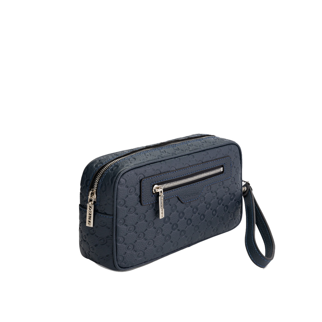Compact clutch with a sleek, patterned design. Main compartment with secure zip closure and additional front zip pocket for easy access. Embossed logo on the front panel. Comes with an adjustable wrist strap for convenience. Deep blue color enhances its sophisticated style. Metal zippers add a touch of contrast. Ideal for organizing essentials in a neat manner.