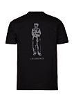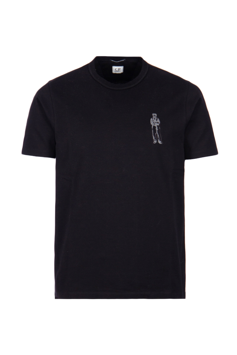 Classic T-shirt from CP Company featuring a crew neck and short sleeves. Regular fit. Front and back display subtle printed figure graphics, adding a distinctive detail. Small logo on the back. Color: black. Ideal for pairing with jeans or cargo pants.