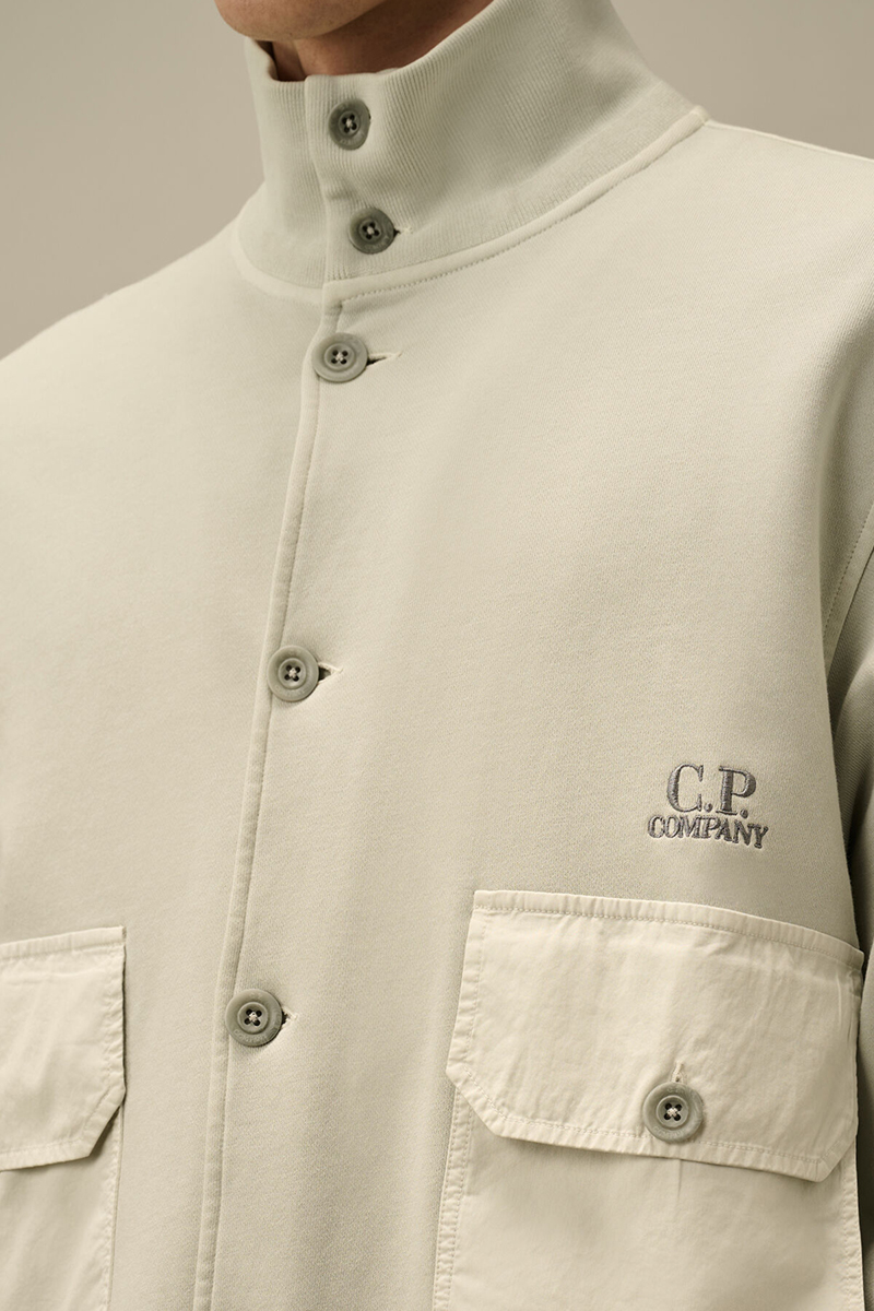 High-neck button-up sweater with a modern look. Features full-length button closure and ribbed collar for a secure fit. Two spacious flap pockets on the front offer practical storage. Embroidered C.P. COMPANY logo subtly placed on the chest. Detailed stitching for a refined finish.