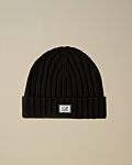 Ribbed knit beanie featuring a classic fold-over design. Minimalistic C.P. Company logo patch on the front. Offers a snug fit. Adaptable for various styles and outfit combinations.