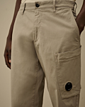 Straight-leg trousers with button closure and standard belt loops. Features a single cargo pocket on the side, complete with a distinct circular logo detail. Includes two side pockets for added convenience. Beige color for versatile styling.