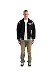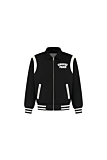 Varsity jacket featuring a classic black design with contrasting white details. Full front zipper closure. Two side pockets with striped trimming. Embroidered Croyez Paris logo on chest and back. Ribbed cuffs and hem with stripe accents.