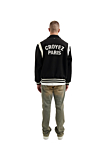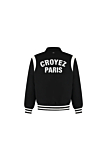 A classic varsity jacket featuring a full zip closure and ribbed cuffs. The jacket includes two front pockets with striped detailing and contrasting white accents on the shoulders. The Croyez Paris logo is embroidered on the chest and back. This jacket provides a versatile and stylish outer layer.