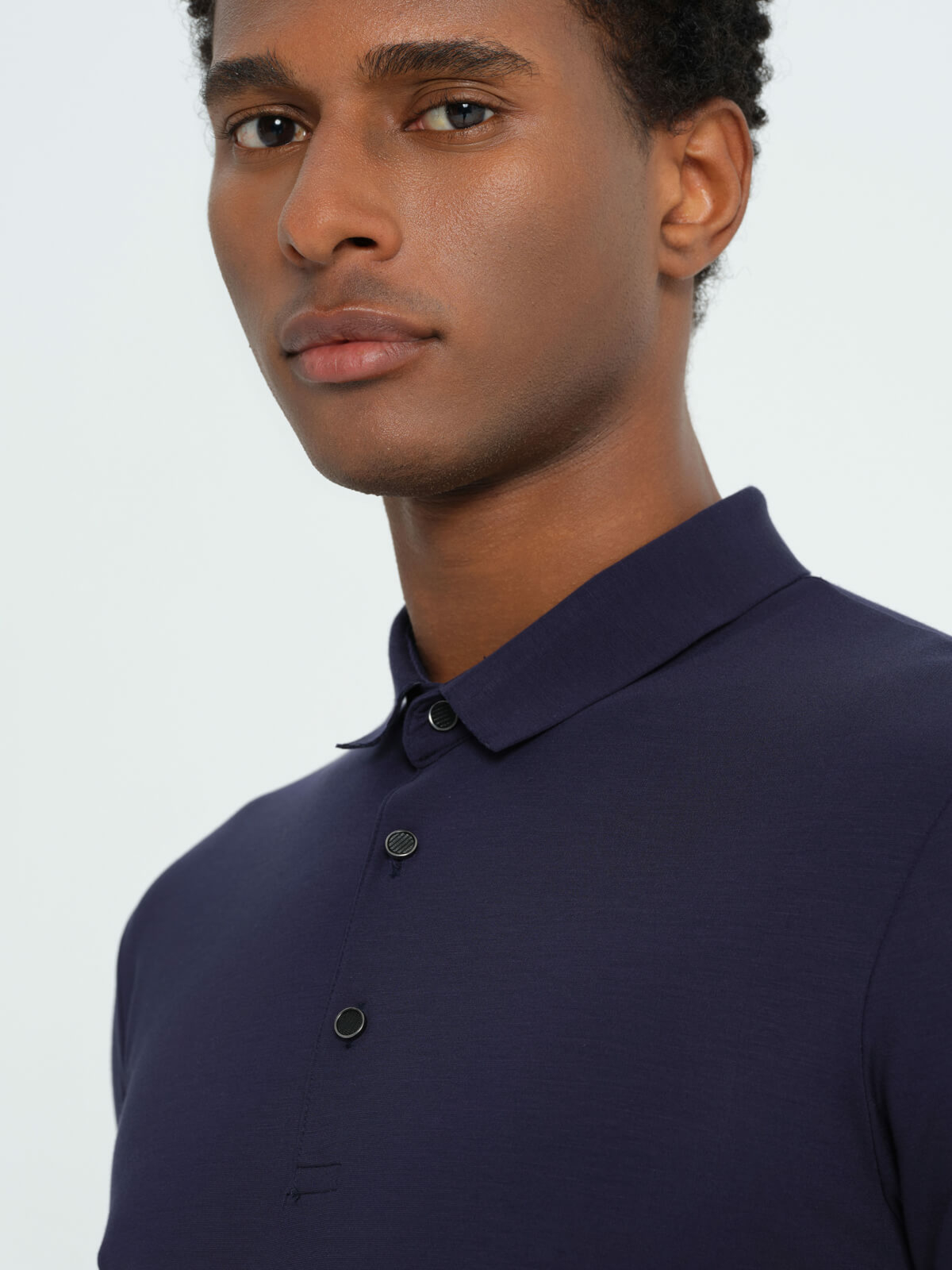 This polo features a classic design with short sleeves and a three-button placket. The tailored fit offers a sleek silhouette. A subtle brand logo is embroidered on the chest area. The garment's fine weave gives it a sophisticated appearance, complemented by reinforced seams. The durable construction ensures long-lasting wear. Side slits at the hem enhance mobility. Suitable for casual and semi-formal occasions.