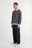 Sweater with classic collar and long sleeves. Patterned design with a mix of blue and white. Features a white polo-style collar and matching cuffs. Embroidered logo and emblem on the chest. Relaxed fit with ribbed cuffs.