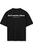 Black T-shirt with a classic crew neck. Features a relaxed fit and short sleeves. Front design includes the "don't waste culture" logo, while the back showcases an extended version of the print. Minimalist aesthetics with a focus on contemporary style.
