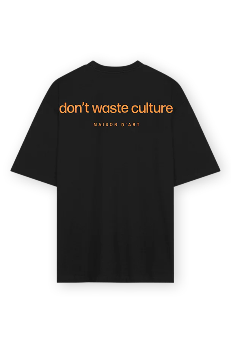 Classic t-shirt design with a regular fit. Black base with bold orange "don't waste culture" text, front and back. Crew neck and short sleeves. Minimalistic design emphasizing statement prints.