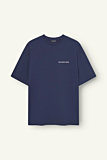 T-shirt with a relaxed fit and classic crew neck. Features drop shoulders and short sleeves. Front and back display subtle printed graphic elements, including brand logo and text detailing. Clean design with minimalistic aesthetic. Color: deep blue.