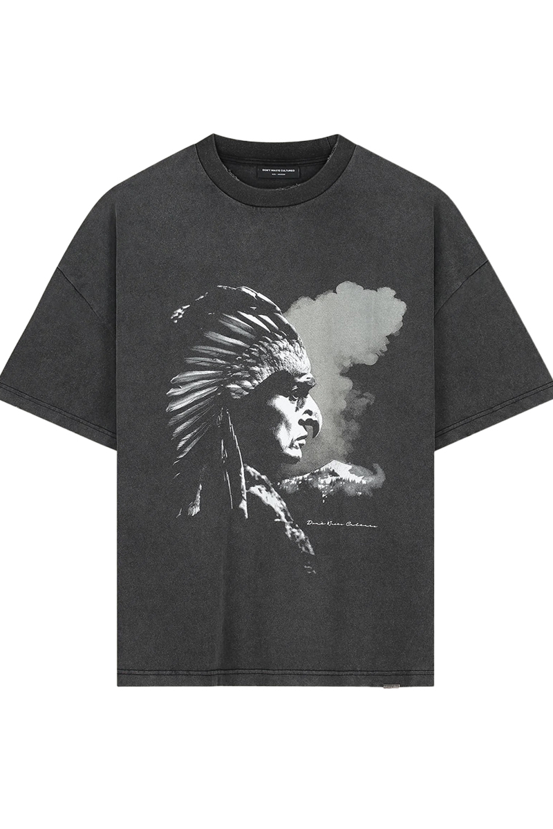 Relaxed fit T-shirt with striking front print. Crew neck and short sleeves. Features subtle branding on the front and back. Color: deep black with artistic print. Ideal for pairing with casual jeans or joggers.