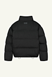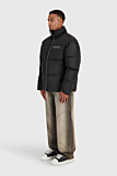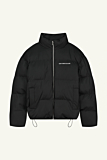 Puffer jacket featuring a high collar and full-length zipper. Straight fit. Two front pockets and subtle logo embroidery on the chest. Drawstring hem for adjustable fit. Color: black.