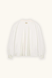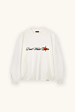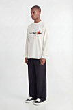 Relaxed fit long sleeve T-shirt with a crew neck. Features a bold front print combining text and a star design. Ribbed cuffs enhance the clean lines at the wrists. The off-white color provides a versatile base for pairing with various pieces. Subtle branding at the back neckline.