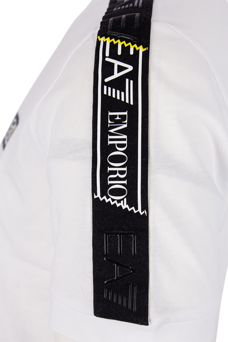Classic crew neck t-shirt with short sleeves. Features a branded stripe along the shoulders and a small EA7 logo on the chest. Crisp white color. Ideal for pairing with casual trousers or shorts.