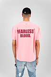 Classic crew neck T-shirt with a relaxed fit. Features short sleeves and bold graphic prints on both front and back. The "Fearless Blood" logo is prominently displayed. The color is a vibrant deep pink. Pairs well with denim and casual wear.