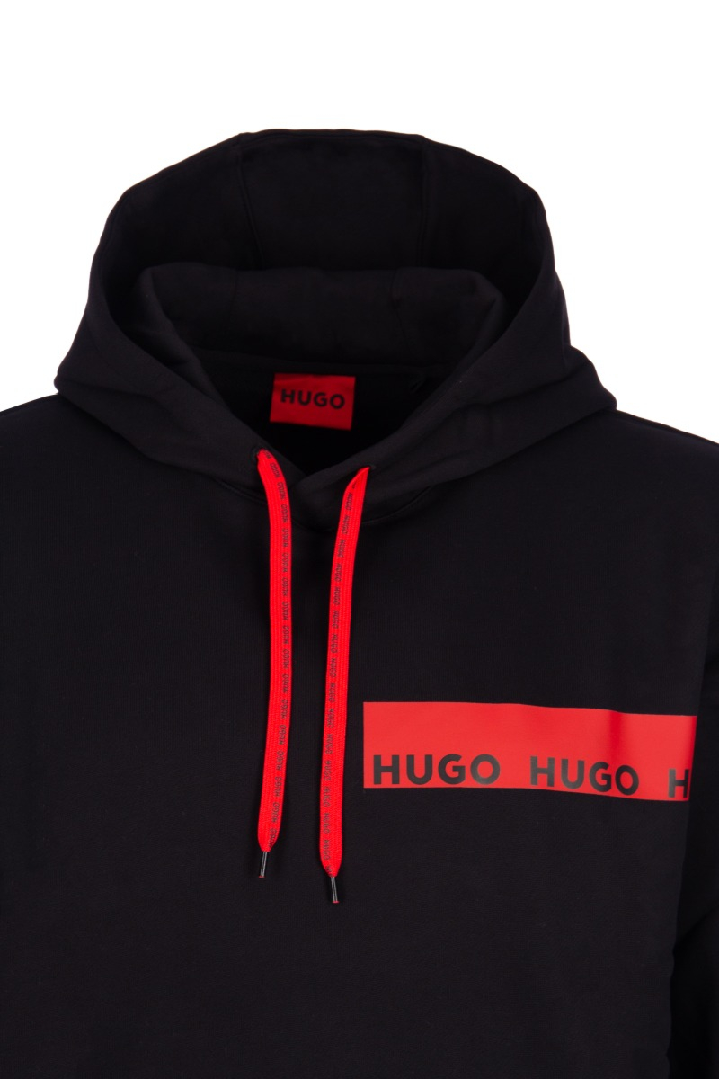 Sweater featuring a relaxed fit and modern design elements. Features include a striking red logo panel across the chest and complementary drawstring accents. Equipped with a classic kangaroo pocket, this sweater combines style with functionality. The item is designed with ribbed cuffs and hem for a secure fit.