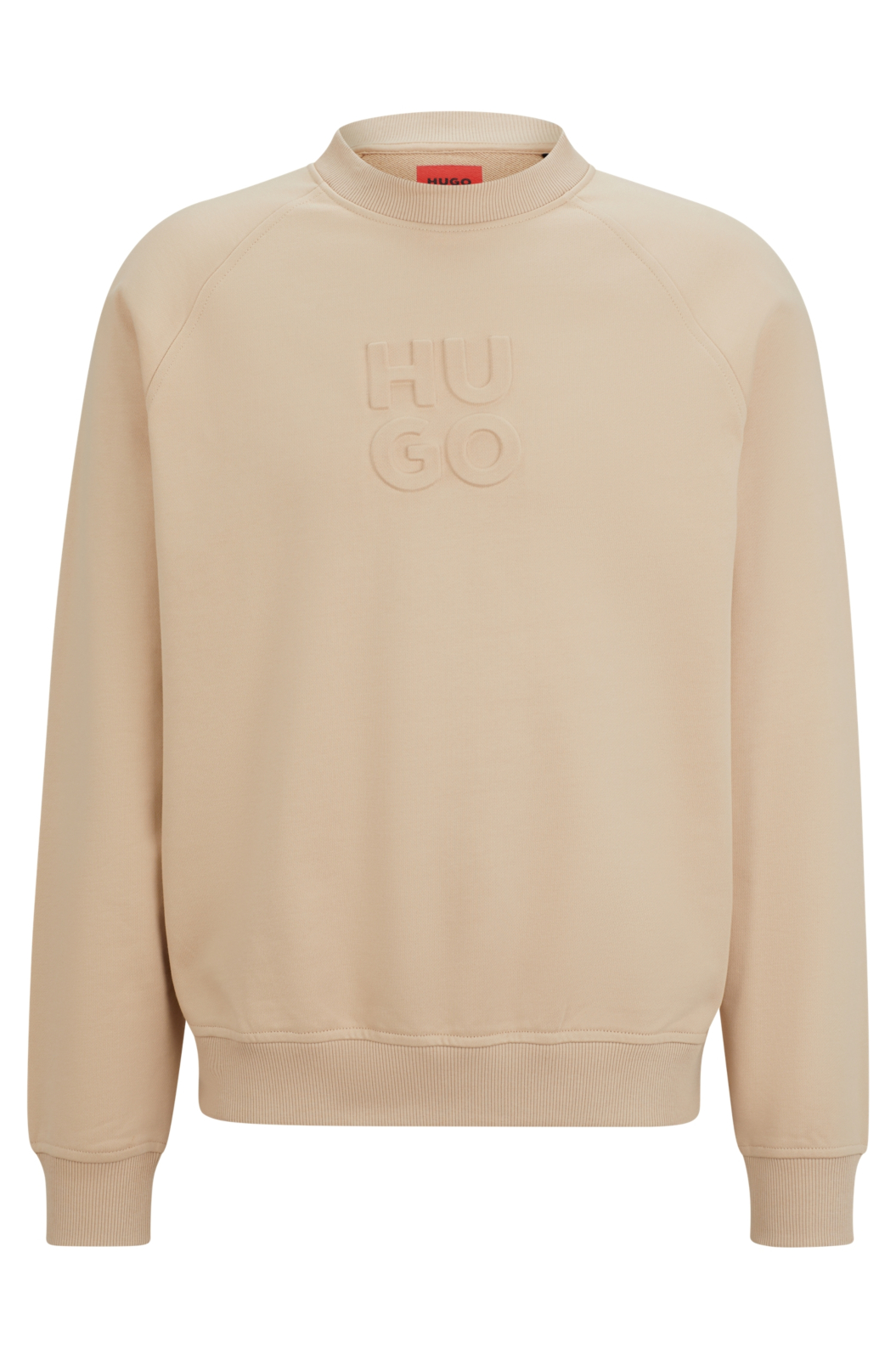 Casual sweater with a regular fit. Features a crew neck and long sleeves with ribbed cuffs and hem. Embossed logo on the chest offers a subtle branding touch. Neutral beige color allows for versatile pairing with various bottoms such as jeans and joggers.