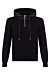 Hoodie featuring a sleek zip closure and adjustable drawstring hood. Textured knit design. Ribbed cuffs and hem with a branded patch on the sleeve. The front zip adds functional flair.