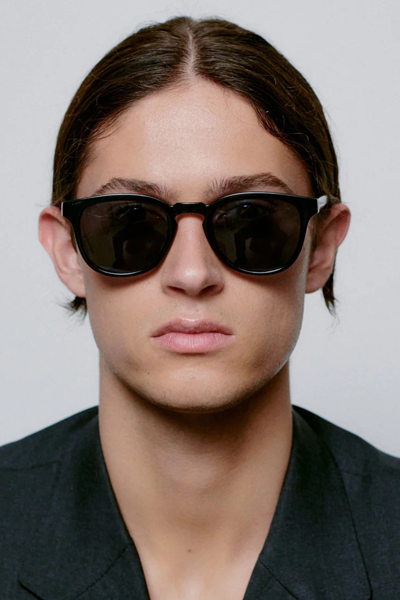 Sleek sunglasses featuring a minimalistic design suitable for everyday wear. The frame is sturdy, providing durability and comfort. The lenses offer UV protection, making them practical for outdoor use. Classic black color adds a versatile touch, complementing various styles and outfits. Discreet logo detailing on the temples.