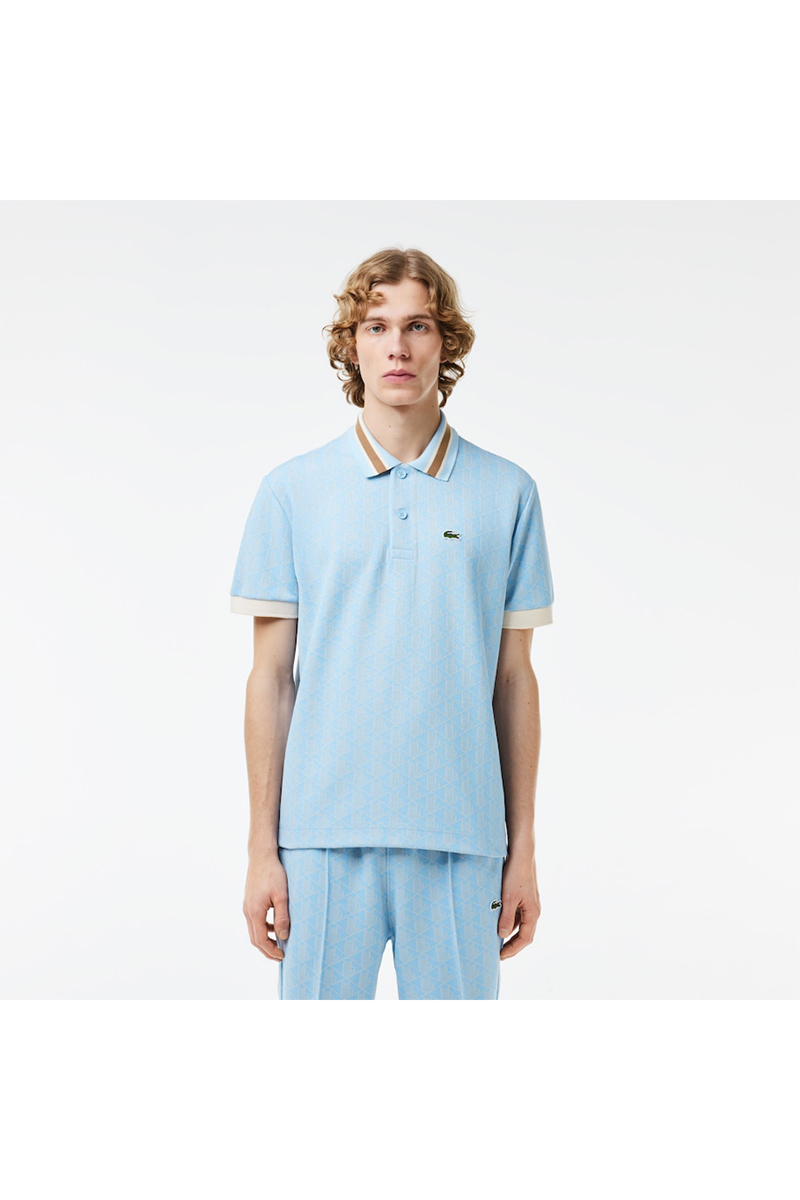 Polo shirt featuring a classic collar with a three-button placket. Light blue color with subtle pattern detailing. Ribbed cuffs and striped collar offer contrast accents. Iconic Lacoste logo embroidered on the chest.