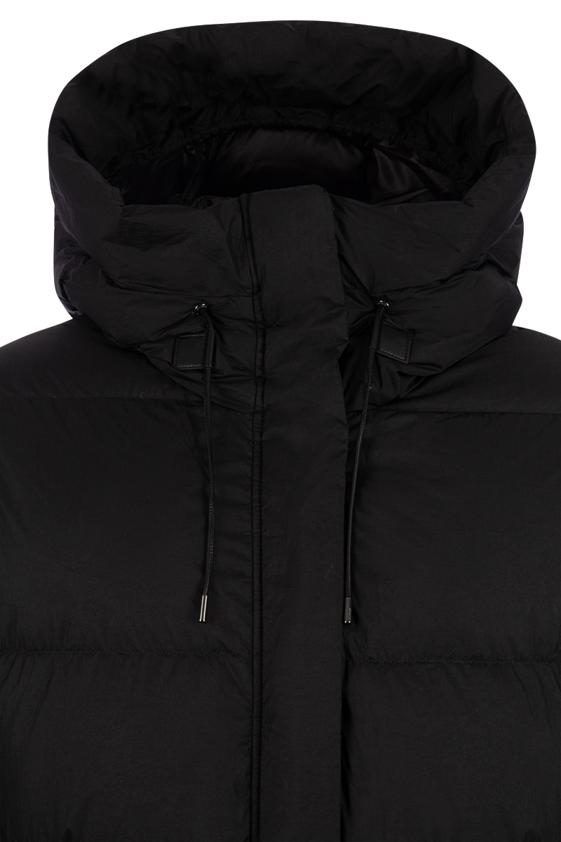 Quilted coat with a sleek silhouette and adjustable waist. Full-length zipper with snap buttons. High collar with integrated hood. Side zipper pockets and rib-knit cuffs. Subtle logo detail on the shoulder.