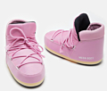 Mid-ankle sneakers with a distinct pink hue. Features a nylon upper and padded interior. Laced front closure with metal eyelets. Moon Boot branding on the heel. Rubber sole for added traction and stability. Available in multiple sizes.